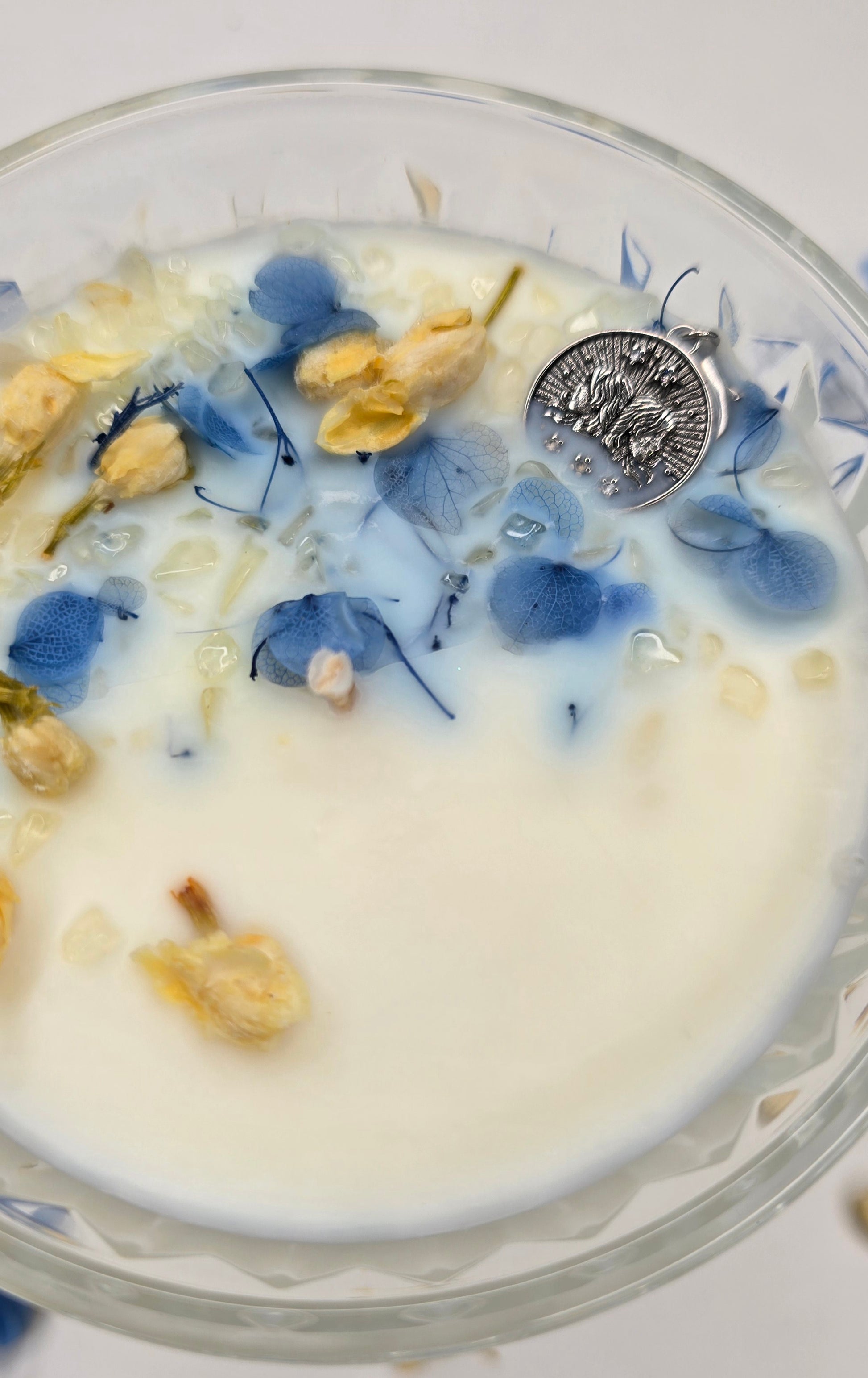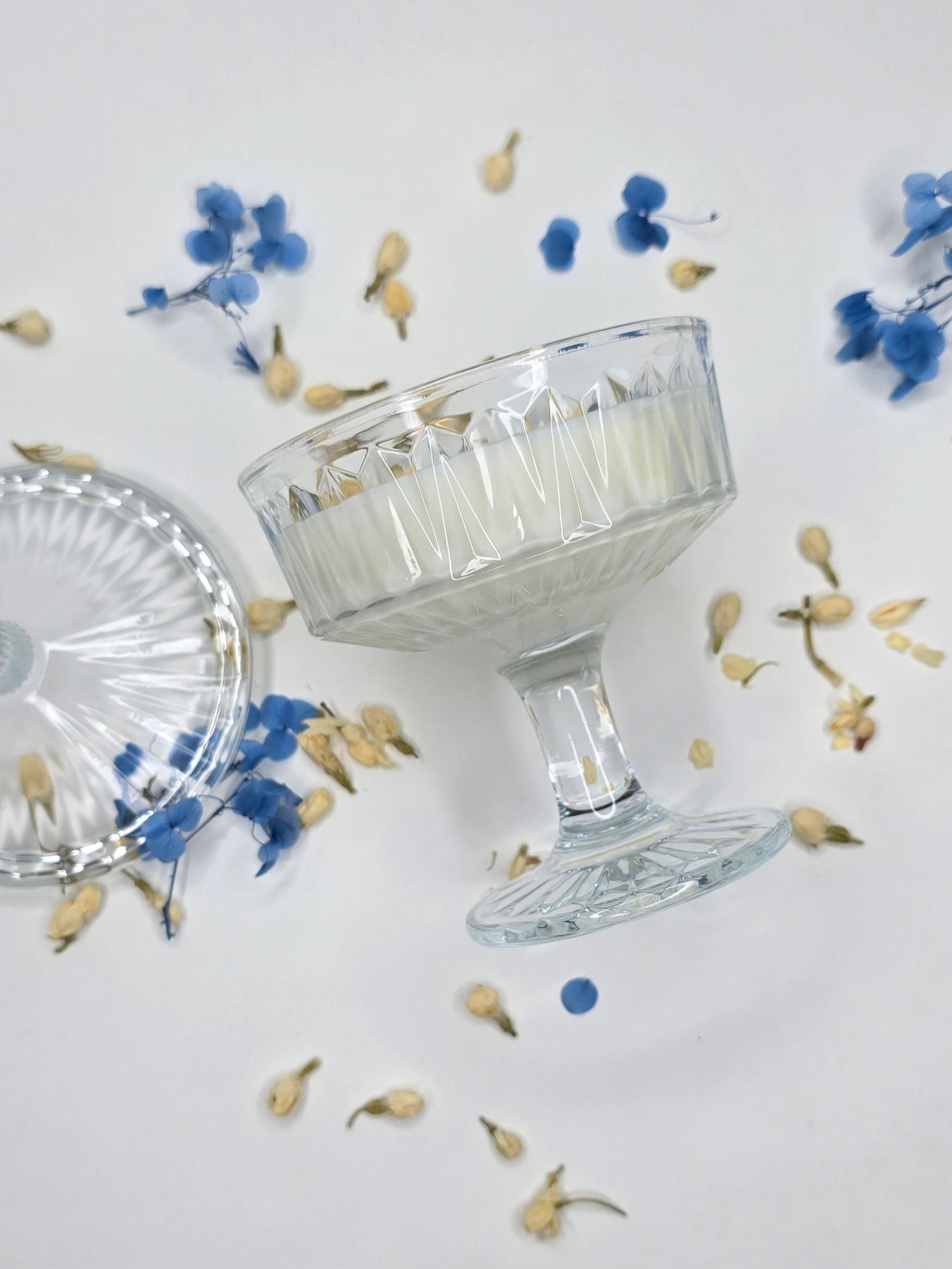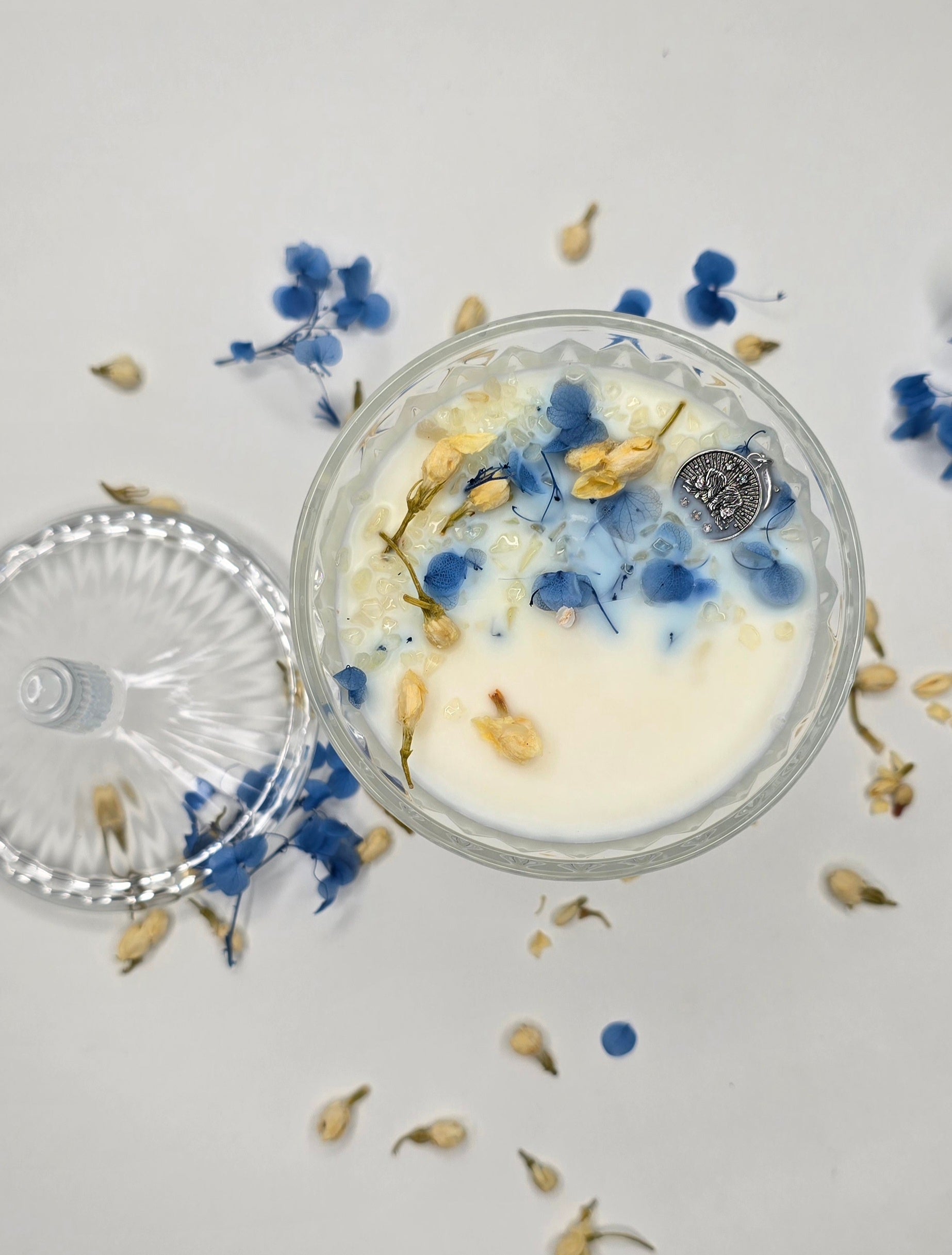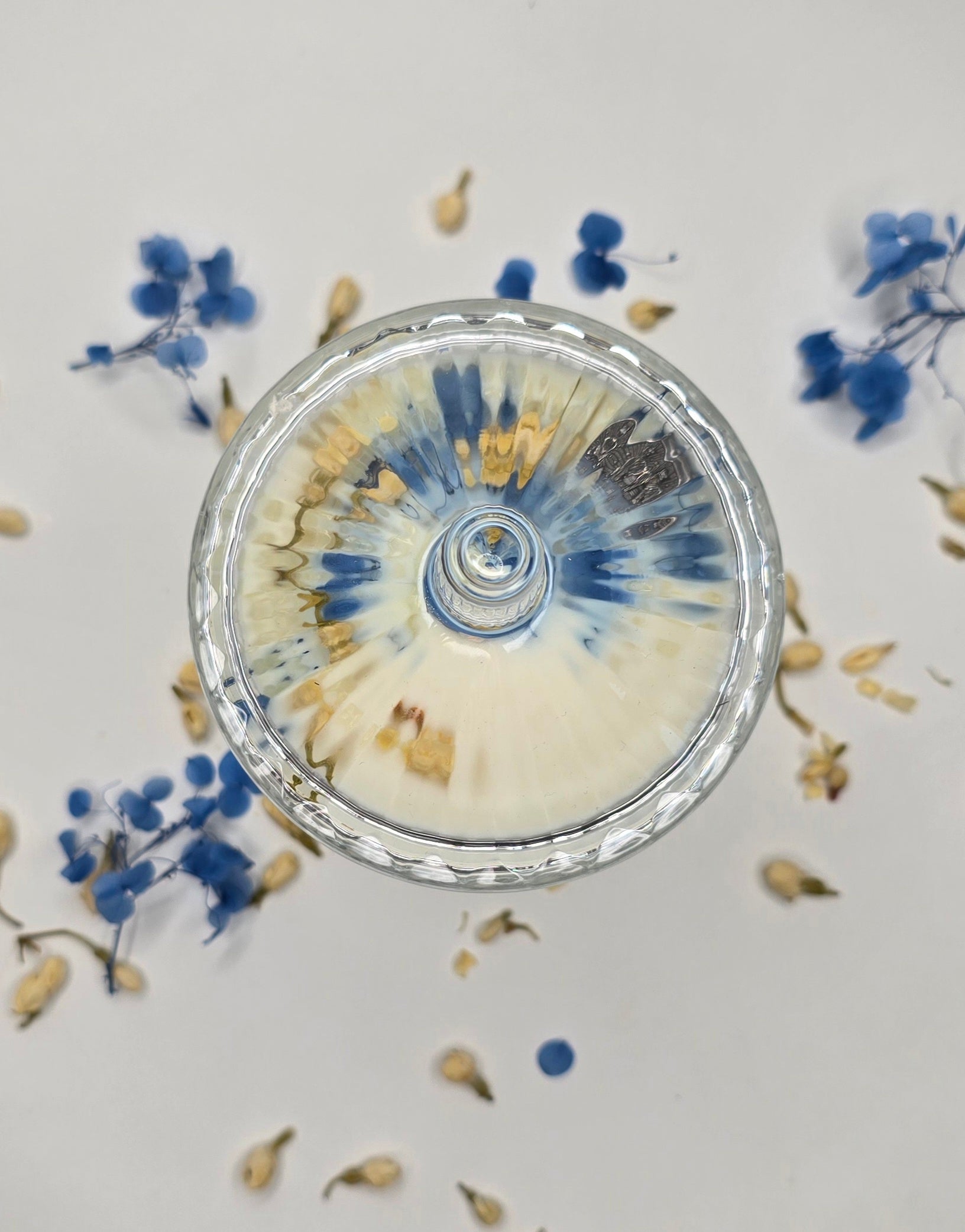 Élevée sur son pied de verre sculpté, cette bougie semble flotter comme une idée brillante. Le bleu azur des fleurs séchées vient réveiller la pureté de la cire, évoquant la clarté d'un ciel d'été. C’est une pièce unique, un hymne à la dualité et à l'intelligence, façonnée pour celle qui sait que la vie est un jeu dont on invente les règles chaque jour."