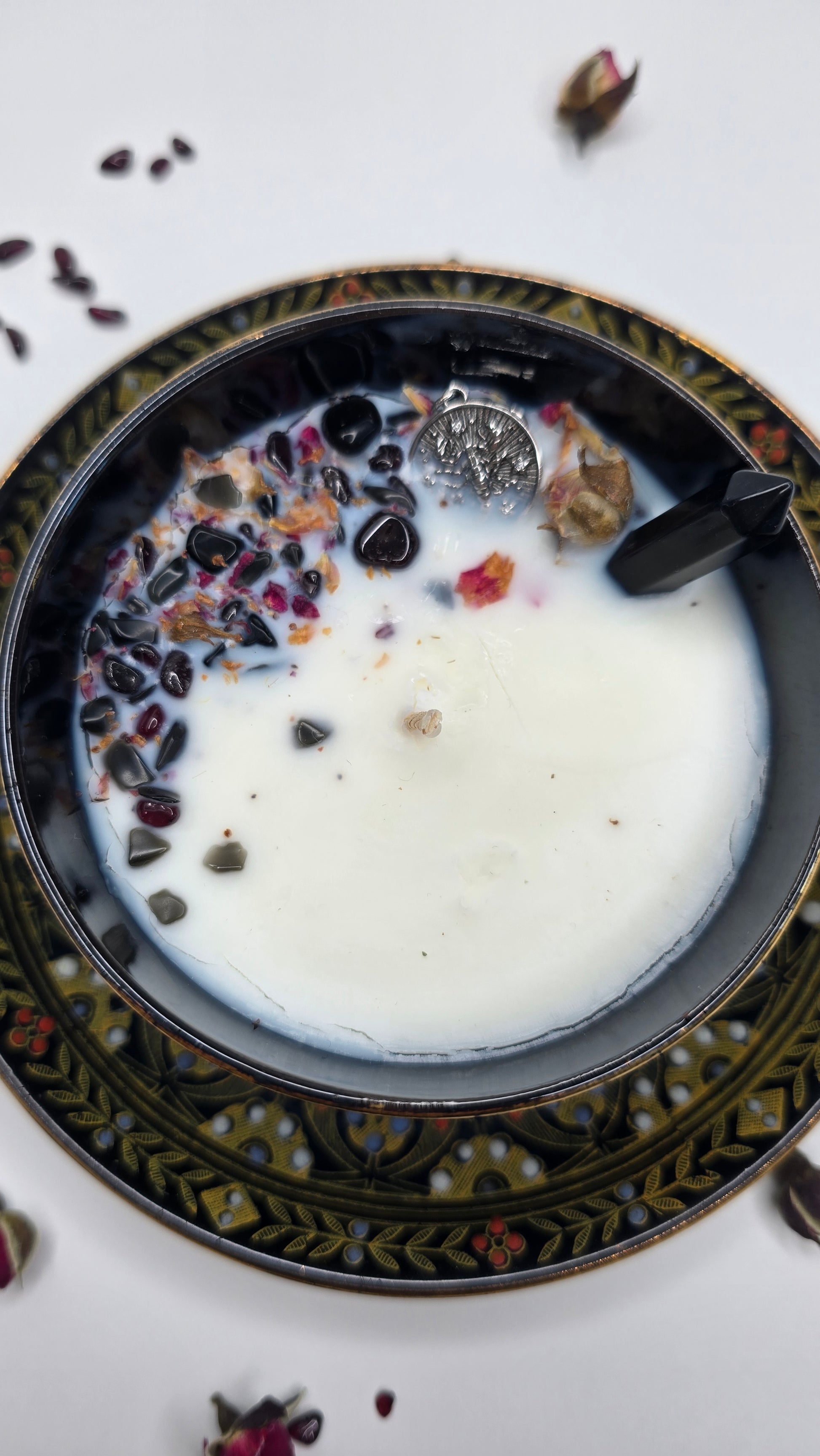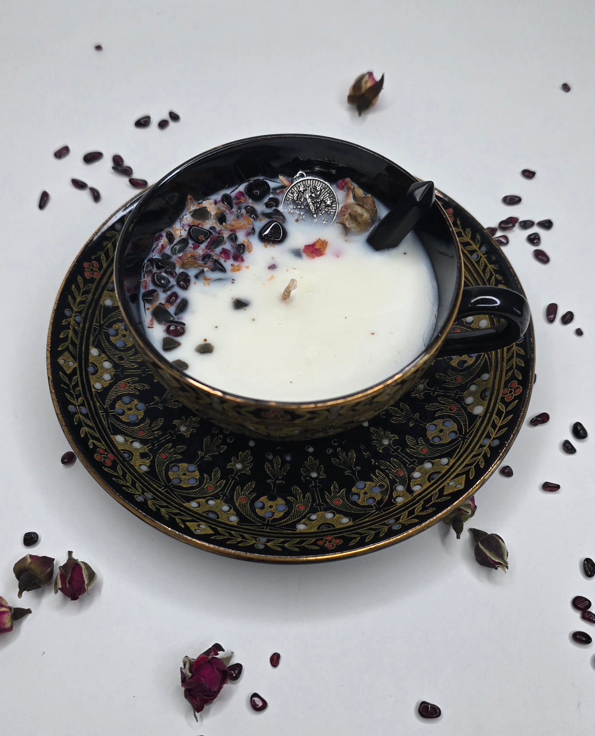Nichée dans son écrin de porcelaine noire aux entrelacs dorés, cette bougie est le miroir de votre complexité fascinante. La pointe d'Obsidienne noire s'élève comme un gardien de vos mystères, entourée d'un parterre de pierres sombres et de roses délicates. C’est une pièce unique, un talisman de métamorphose façonné pour celle qui sait que c'est dans l'obscurité que brillent les plus belles étoiles."