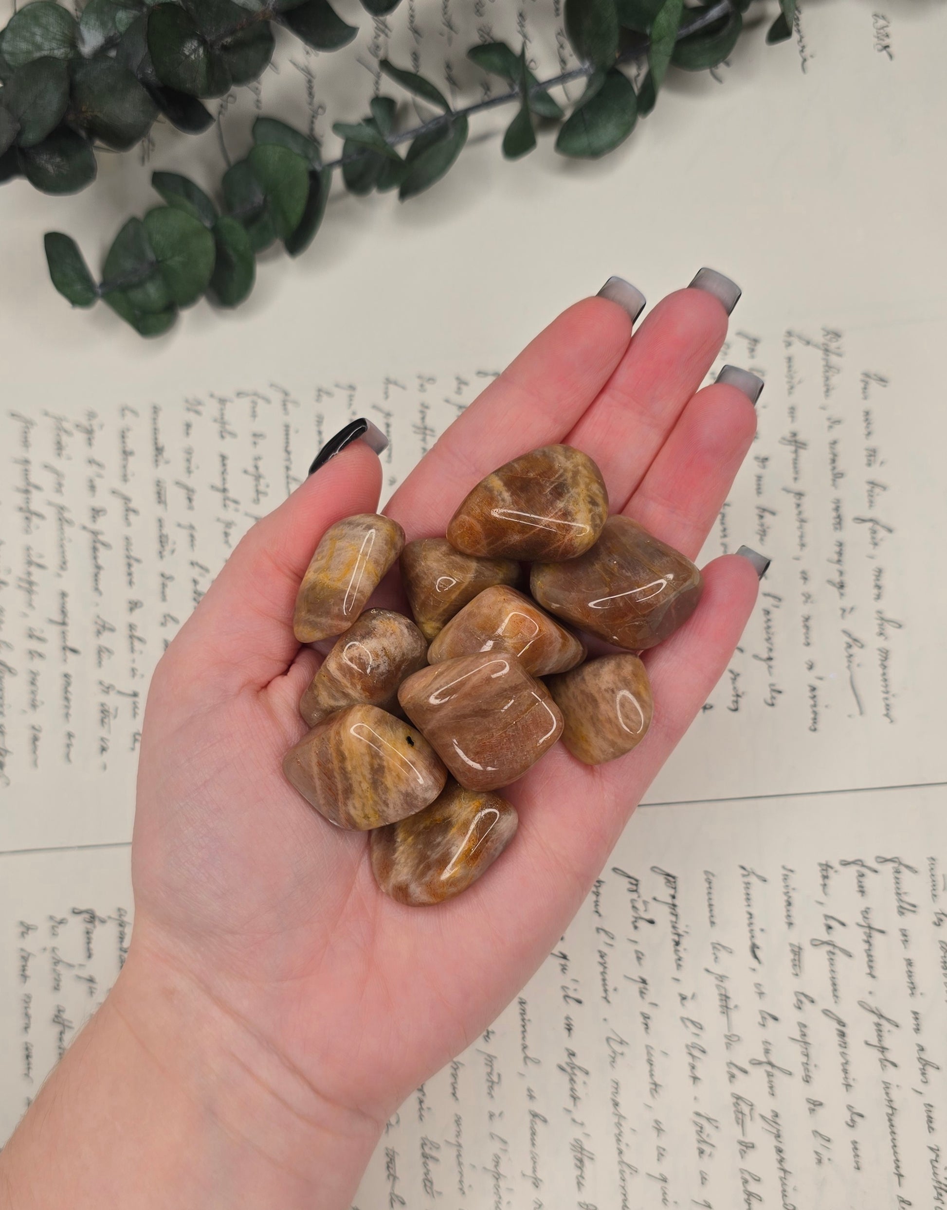 Découvrez l'élégance solaire de notre Pierre de Lune Orangée, une variété rare et lumineuse qui séduit par ses nuances allant du pêche délicat à l'abricot intense. Chaque pierre roulée est une invitation à admirer la douceur des textures minérales naturelles.