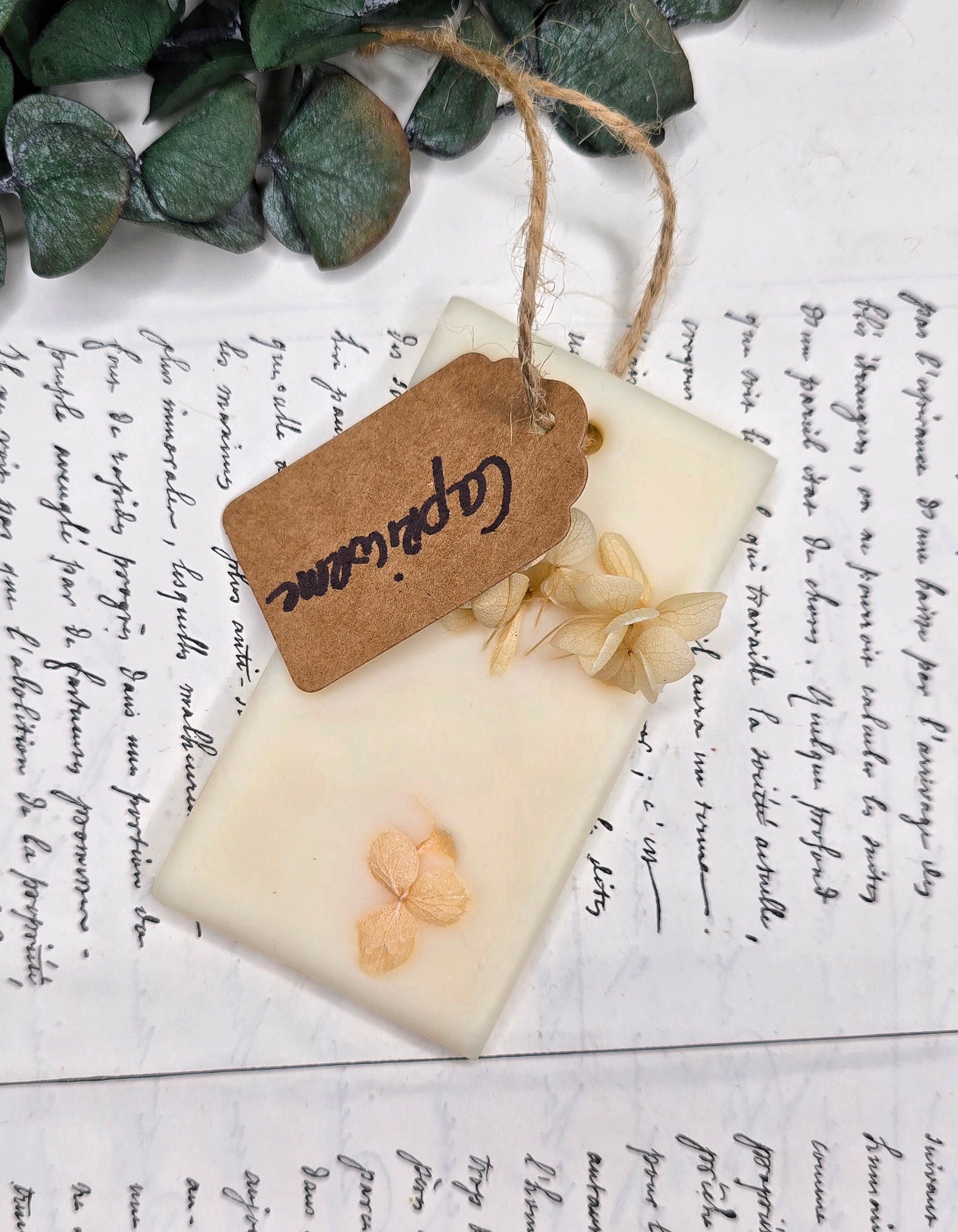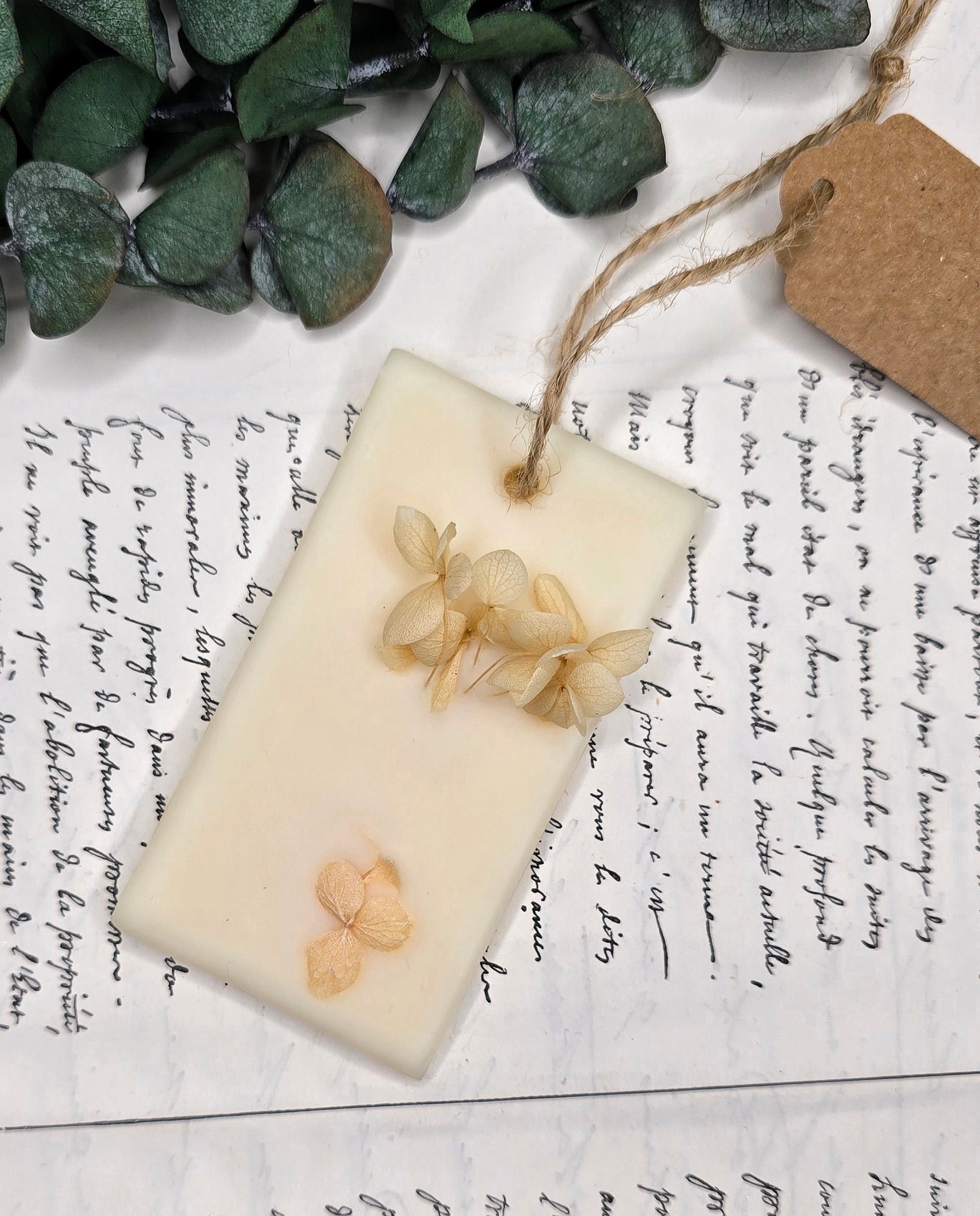 Une création artisanale pensée pour harmoniser votre intérieur. Cette suspension diffuse naturellement ses notes douces et poudrées dans vos petits espaces (penderies, tiroirs, bureau).